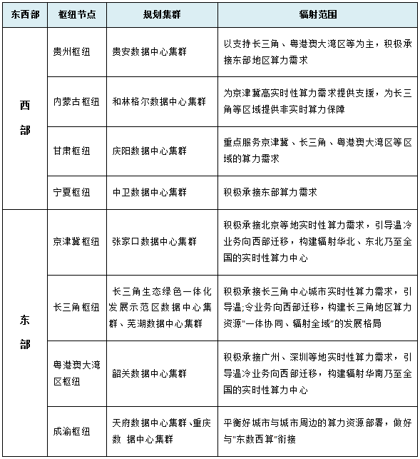 近日,國家發(fā)改委、中央網(wǎng)信辦、工業(yè)和信息化部、國家能源局聯(lián)合印發(fā)通知,同意在京津冀、長三角、粵港澳大灣區(qū)、成渝、內(nèi)蒙古、貴州、甘肅、寧夏等8地啟動建設(shè)國家算力樞紐節(jié)點(diǎn),并規(guī)劃了10個國家數(shù)據(jù)中心集群。至此,全國一體化大數(shù)據(jù)中心體系完成總體布局設(shè)計(jì),“東數(shù)西算”工程正式全面啟動。