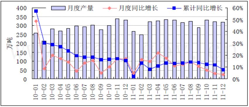 2010-2011年全國原煤月度產量及同比增速