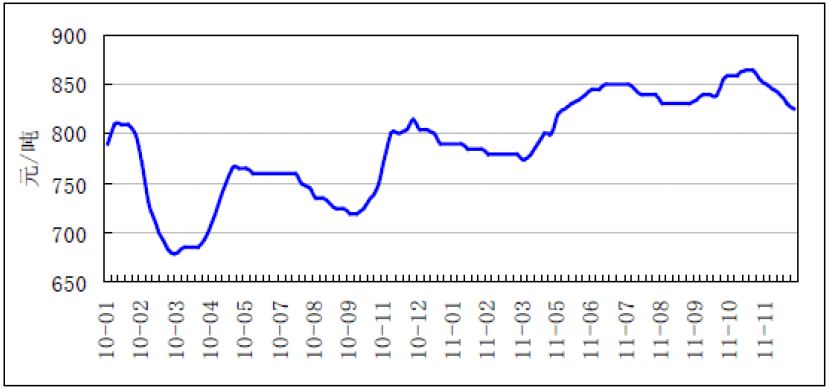 2010—2011年秦皇島港5500大卡山西優混煤炭平均價格煤炭價格走勢
