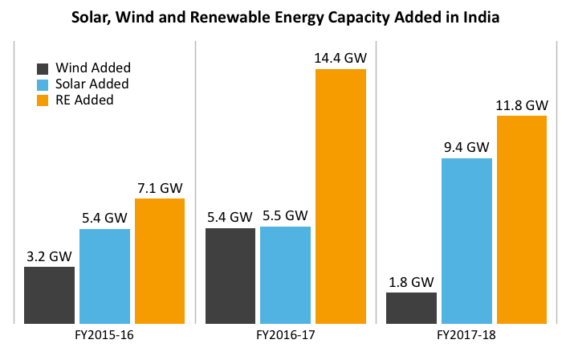 由于風能和屋頂太陽能發電行業增速放緩,印度連續第二年未能實現其可再生能源發展目標。2017年4月至2018年3月期間,印度聯網可再生能源裝機容量為11.75吉瓦,低于設定的14.45吉瓦的目標。