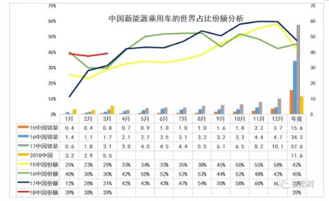 2018年一季度中國新能源乘用車的世界份額達到39%,,前三個月的份額基本保持在39%不變。這16年,中國新能源車在世界份額達到45%,17年達到48%,但是其中特征都是前低后高,的走勢,3月份的新車份額總體是中國相對較低的,2018年的份額在年初表現就特別突出,未來仍有增長潛力。