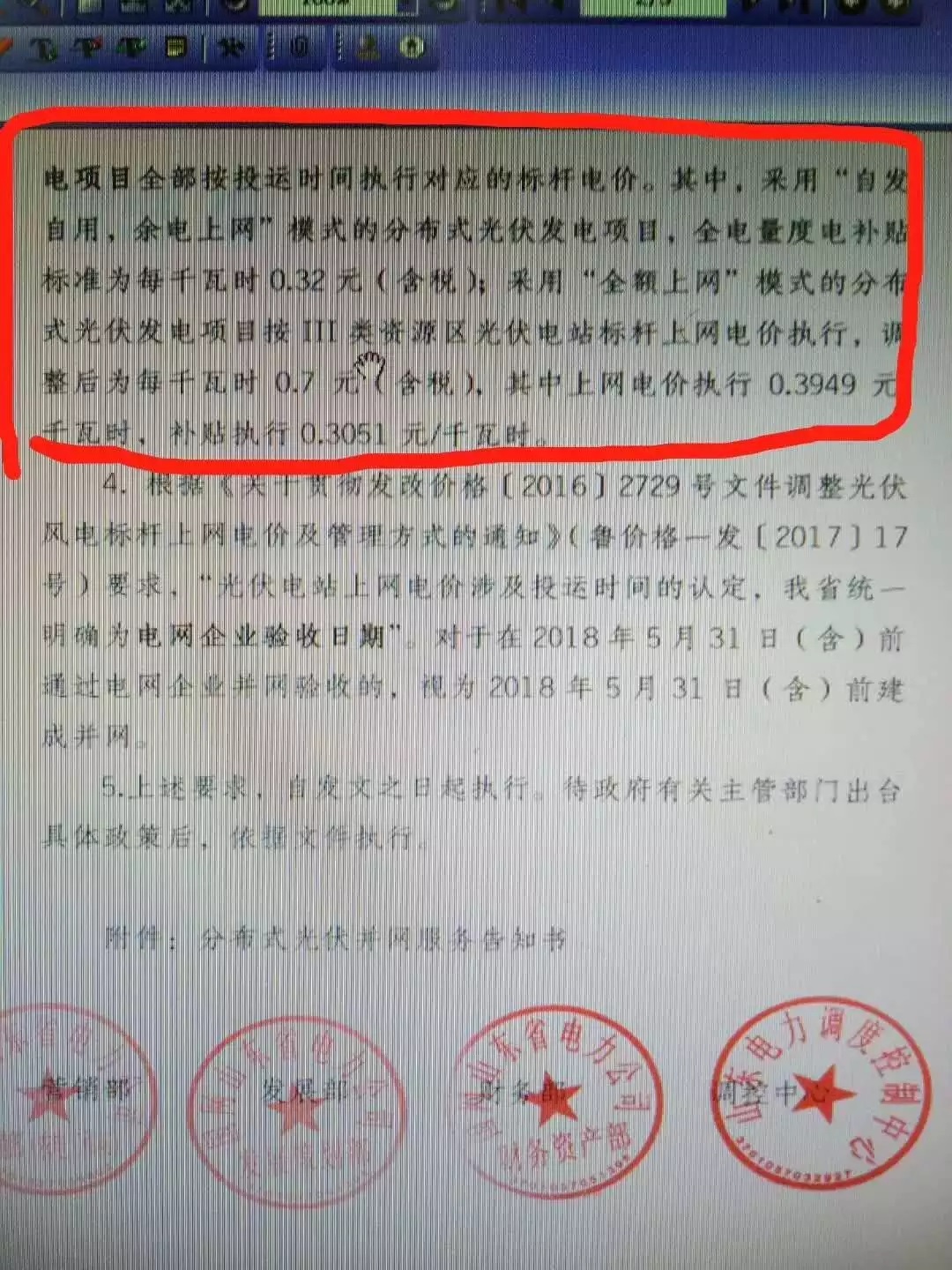 4.根據(jù)《關(guān)于貫徹發(fā)改價格[2016]2729號文件調(diào)整光伏風電標桿上網(wǎng)電價及管理方式的通知》(魯價格一發(fā)[2017]17號)要求,“光伏電站上網(wǎng)電價涉及投運時間的認定,我省統(tǒng)一明確為電網(wǎng)企業(yè)驗收日期”。對于在2018年5月31日(含)前通過電網(wǎng)企業(yè)并網(wǎng)驗收的,視為2018年5月31日(含)前建成并網(wǎng)。
