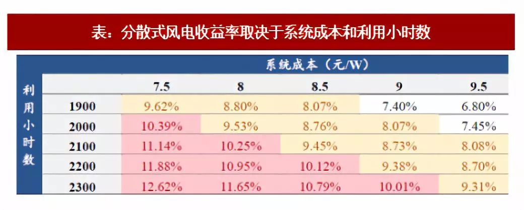 ▼表:分散式風電收益率取決于系統成本和利用小時數