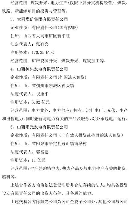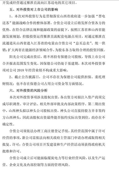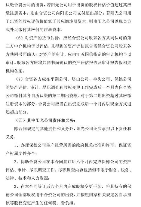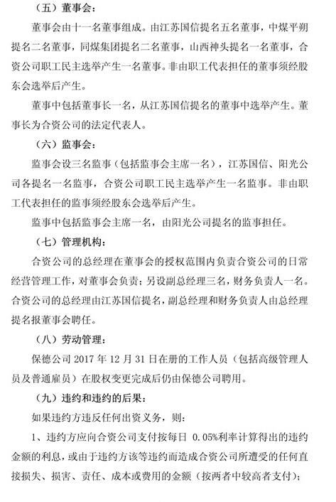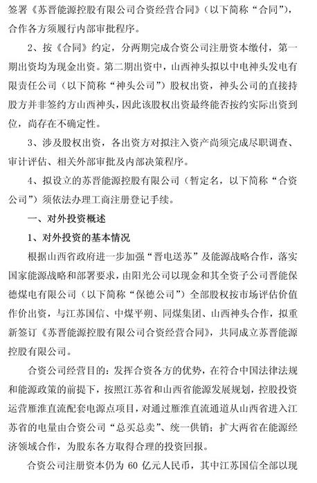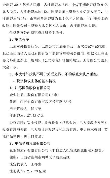 由陽光公司以現金和其全資子公司晉能保德煤電有限公司(以下簡稱“保德公司”)全部股權按市場評估價值作價出資,與江蘇國信、中煤平朔、同煤集團、山西神頭合作,擬重新簽訂《蘇晉能源控股有限公司合資經營合同》,共同成立蘇晉能源控股有限公司。