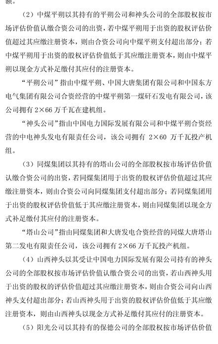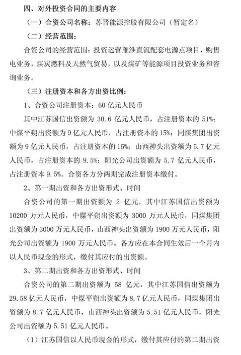 合資公司注冊資本仍為60億元人民幣,其中江蘇國信全部以現3金出資30.6億元人民幣,占注冊資本51%;中煤平朔出資額為9億元人民幣,占注冊資本的15%;同煤集團出資額為9億元人民幣,占注冊資本的15%;山西神頭出資額為5.7億元人民幣,占注冊資本的9.5%;陽光公司出資額為5.7億元人民幣,占注冊資本9.5%。