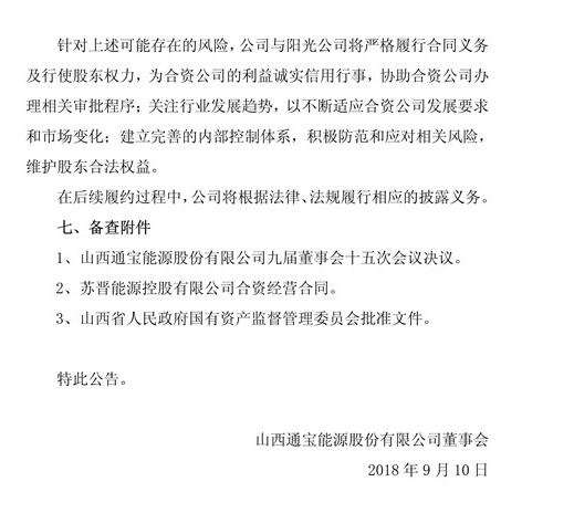 山西通寶能源股份有限公司日前發布公告:因原合同一方大唐發電退出合作,經其余投資方協商一致,擬重新簽訂《蘇晉能源控股有限公司合資經營合同》。