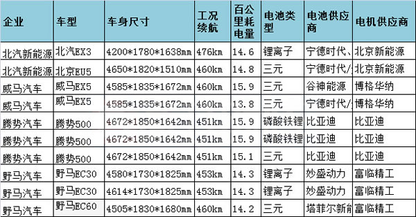 需要特別提及的是,在今年推出的新能源乘用車中,工況續航里程在450km以上的車型共有10款,來自北汽、騰勢、威馬、野馬四家車企;而工況續航里程最高達到了476km,來自北汽旗下的EX3車型,搭載了寧德時代提供的能量密度為151.37Wh/kg的動力電池。