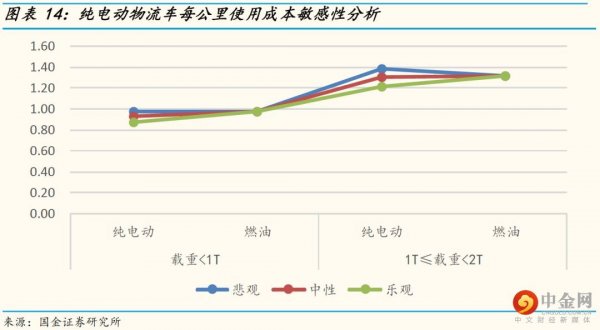 中性情形分析:動(dòng)力電池降本合理,成本下降30%,電動(dòng)物流車售價(jià)下降15%,純電動(dòng)物流車經(jīng)濟(jì)性優(yōu)于燃油物流車,但是差距不大。這種情況下,純電動(dòng)物流車的全壽命周期總成本相對(duì)于燃油車都低1%-5%,載重1T以下純電動(dòng)物流車每公里使用成本0.93元,而同級(jí)別燃油物流車每公里使用成本0.98元;載重處于1-2T的純電動(dòng)物流車每公里使用成本1.3元,略低于燃油物流車的1.32元。