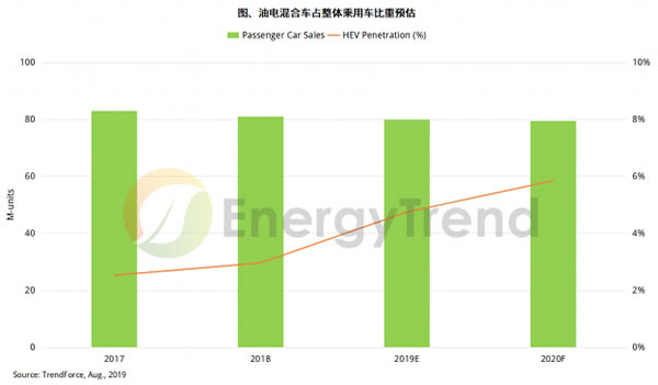 受惠于中國新版新能源車積分制度以及歐、美、日等市場規模擴大,油電混合動力車的市場商機備受關注。集邦咨詢旗下新能源研究中心集邦新能源網EnergyTrend預估,2019年全球油電混合車市占將達5%,相較之下,全球純電動乘用車僅2%。
