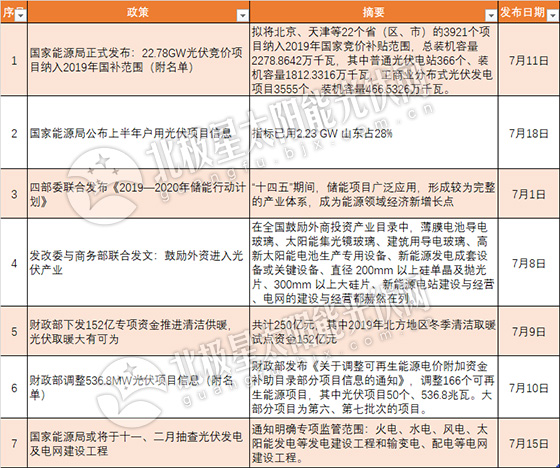 7月,國家政策主要包括光伏補(bǔ)貼競價(jià)機(jī)制、戶用光伏市場、財(cái)政部調(diào)整可再生能源補(bǔ)貼、光伏取暖等。