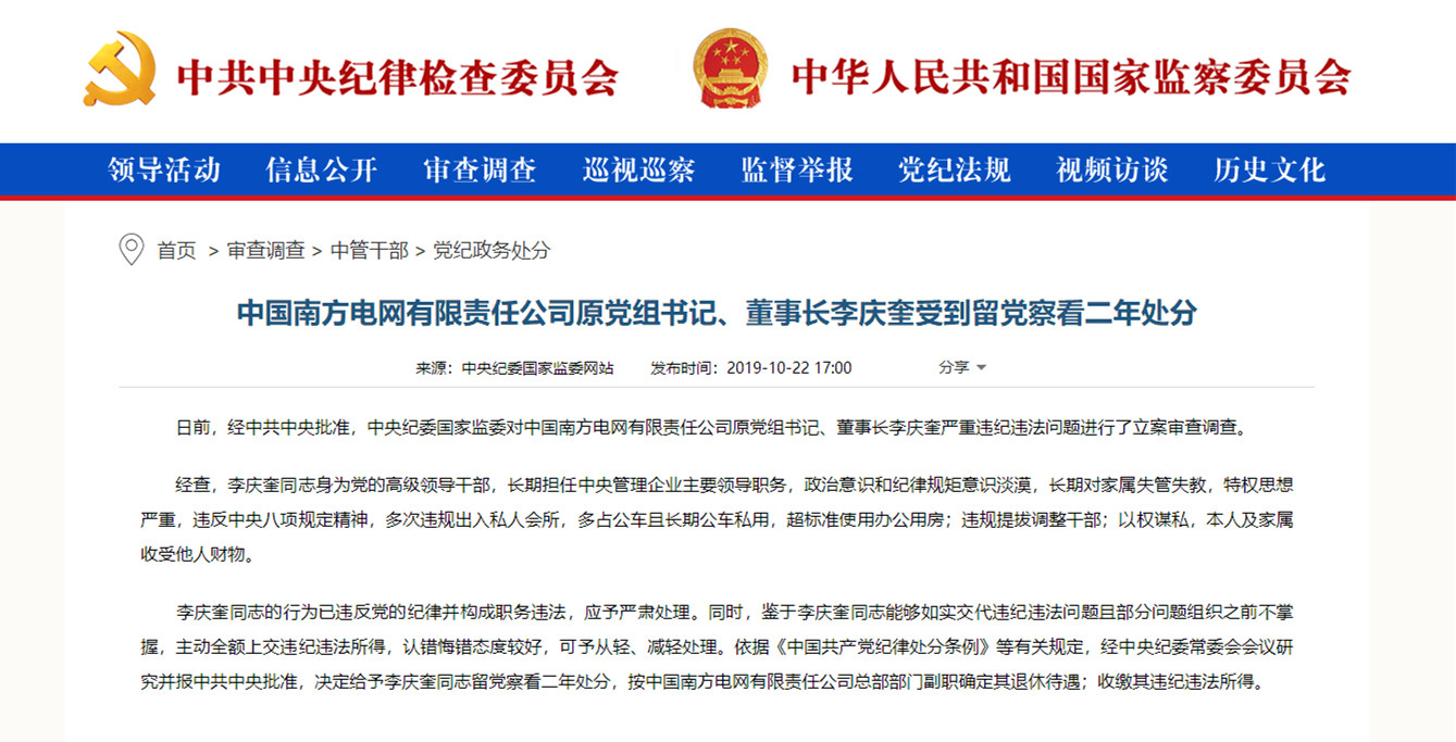 日前,經(jīng)中共中央批準(zhǔn),中央紀(jì)委國(guó)家監(jiān)委對(duì)中國(guó)南方電網(wǎng)有限責(zé)任公司原黨組書(shū)記、董事長(zhǎng)李慶奎嚴(yán)重違紀(jì)違法問(wèn)題進(jìn)行了立案審查調(diào)查。