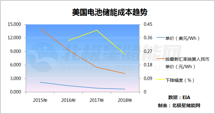 美國能源署的數(shù)據(jù)顯示,美國的電池儲能成本從2015年的2.153美元/Wh降到2018年0.625美元/Wh,三年儲能成本降幅超70%。2018年還曾有國外調(diào)研機(jī)構(gòu)預(yù)估,到2022年電池儲能系統(tǒng)價格將以每年8%的速度下降。