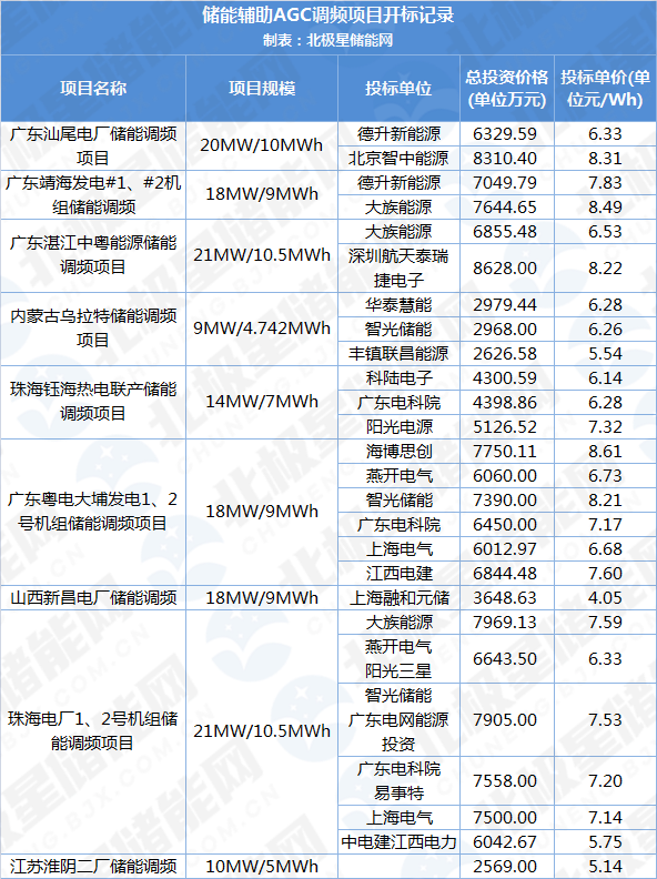 作為商業(yè)模式相對成熟的火儲調(diào)頻領(lǐng)域,采用2C電池、儲能規(guī)模均為21MW/10.5MWh的兩個項目為例,2019年10月廣東湛江中粵能源儲能調(diào)頻項目參與投標(biāo)價格為6.53元/Wh、8.22元/Wh,而今年9月開標(biāo)的廣東湛江中粵能源儲能調(diào)頻項目,參與投標(biāo)的六家企業(yè)給出的單價最高7.59元/Wh,最低5.75元/Wh,較去年下降了約10%左右。而據(jù)北極星儲能網(wǎng)了解,最近開始招標(biāo)的江蘇淮陰二廠儲能調(diào)頻項目最高限價約5.14元/Wh,幾乎是近兩年來的最低價,相較一年前的中標(biāo)價格降了21.29%。