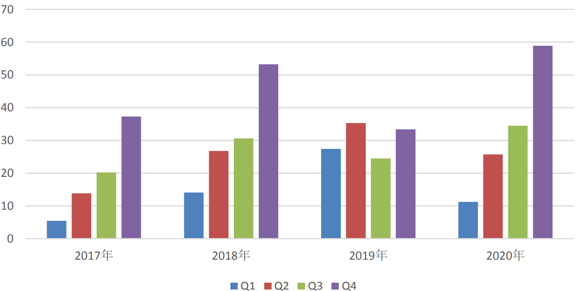2017-2020年我國新能源汽車季度銷量情況(單位:萬輛,Q4為預測值)數據來源:中汽協