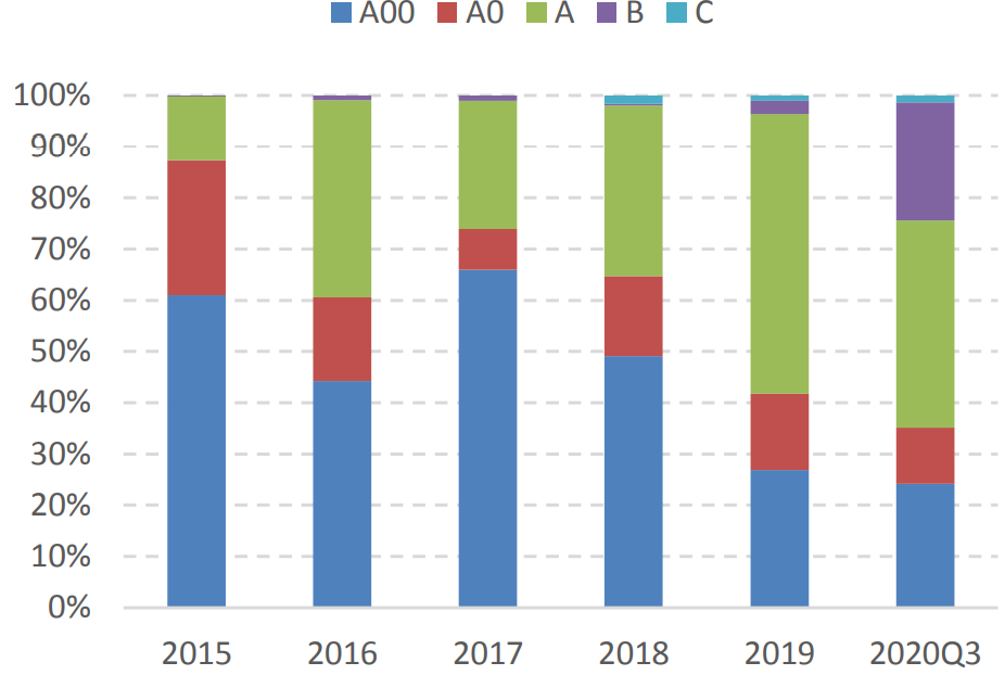 2020年1-9月,我國新能源汽車累計銷量達到71.4萬輛。而且,從銷量結構來看,用于私人消費和出行市場的新能源乘用車已經占絕對主力,新能源商用車累計銷量才7萬輛,占比從2015年的37%下降到了9.8%。新能源乘用車作為大眾消費的市場,銷量表現決定了整體行業的情況。而B端2020需求較弱主要原因在于2019年受地方出租車、網約車電動化政策刺激,出現了搶裝機的現象,占比大幅提升至28.8%;2020年由于疫情影響公共出行需求,需求大幅減少。