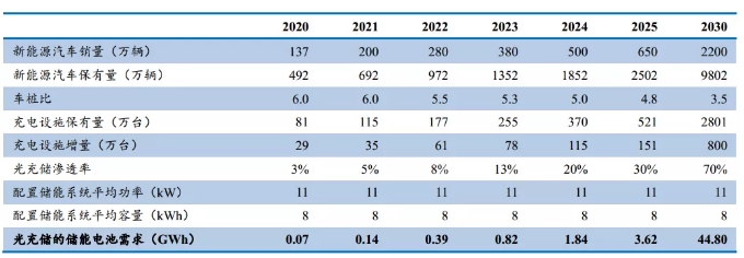 政策方面,工信部發布的《新能源汽車產業發展規劃(2021-2035年)》明確提出,鼓勵“光儲充放”(分布式光伏發電—儲能系統—充放電)多功能綜合一體站建設,未來光儲充一體化充電站模式有望推廣。據民生證券研究院測算,預計 2021-2025 年光儲充一體化的儲能系統需求約 6.8 GWh,其中 2025 年儲能系統需求約 3.62GWh;長期看來,預計 2030 年儲能系統需求約 44.8GWh。