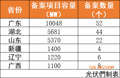 從省份來看,廣東、湖北、山東、新疆、遼寧、廣西等省份倍受投資企業(yè)的青睞。其中,廣東以52個項目、10.048GW規(guī)模位列所統(tǒng)計的15省備案數(shù)量及規(guī)模第一。目前,湖北、山東已在備案項目已突破過5GW,新疆、遼寧、廣西也已突破1GW。