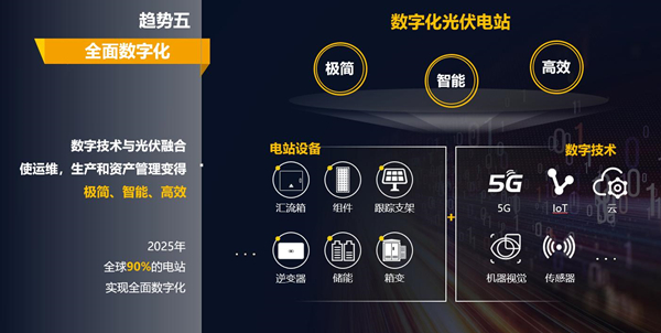 數字技術與光伏技術融合,使運維、生產管理和資產管理變得極簡、智能、高效。數字化是智能化基礎。隨著5G、云等數字化技術快速演進,預計2025年將有90%以上的電站實現全面數字化,讓光伏電站極簡、智能、高效的管理成為可能,從一個啞電站變成一個有機的智能生命體。