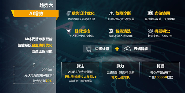 受益于人工智能及物聯網技術,通過集成海量的專家經驗和不斷的自學習,讓算法、算力、算據在計算中發揮最大作用,AI將在很大程度上代替運維專家進行診斷決策。通過智能跟蹤算法,讓組件、支架、逆變器協同運行,找到最佳角度,釋放最大潛力。智能IV診斷,精準定位故障,將運維工作量從“月”降低到“分鐘”。無人機空中巡檢電站、清洗機器人清洗組件、智能安防和人臉識別等技術,使光伏電站不斷完善系統設計優化、故障診斷、光儲協同、智能巡檢、智能清洗、機器視覺,全面提升發電效率和重構運維體驗。從而助力電站生產力和安全性提升。預計到2025年,光伏電站應用AI技術比例達到70%。