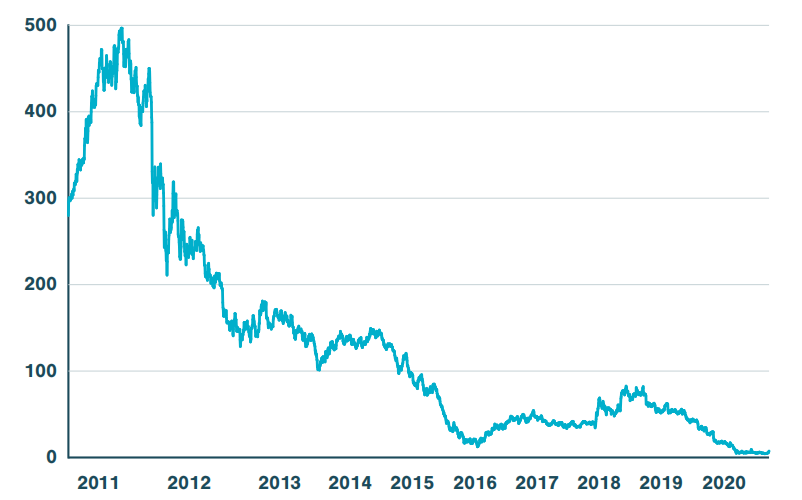 塞巴說,“新的太陽能或風力發電裝置的總成本已經低于天然氣、煤炭和核能等傳統發電的運營成本。意味著,即使建造傳統的發電裝置不需要任何成本,但僅從運營成本來看,仍然比太陽能或風力發電裝置昂貴。” “然而,不現實但很容易糾正電力的平準化成本可能繼續推動對傳統電力的投資。一旦錯誤的LCOE成本和實際的平準化成本之間的差異變得無法否認,金融市場將迅速發展,養老金、退休和捐贈基金的數萬億投資可能變得一文不值。這方面的一個例子就是,美國煤碳(股票等的)市值中所反映的美國道瓊斯美國煤炭指數,坍塌99%,從2011年的高點500跌到2020年的5,此時該指數本身被標準普爾全球悄然停止。