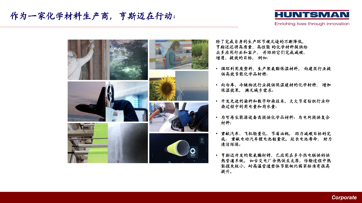 深耕能源化工行業數十載的程紅女士重點分析了化工與化學品行業將如何深度介入潛在的中國碳減排路徑,她從行業和企業的雙重角度闡述了“雙碳目標“給化工行業帶來的綠色發展契機,以及化工企業在生產端和消費端持續參與中國碳達峰和碳中和進程的重要性。以亨斯邁集團為例,她列舉了不同業務部門的化學品在賦能客戶實現可持續發展、降低碳足跡方面的產品應用。她認為,在節能、降耗、減碳的潛力和硬性任務之外,化工行業可以向直面消費端的工業、建筑及交通運輸等領域提供化學材料解決方案助力其實現節能減碳。在談到中國碳減排的關鍵時,她說:“目前,過度使用化石能源而造成的二氧化碳過度排放是全球氣候變化的焦點問題。而在中國,這個問題主要集中在煤炭在發電、供熱和工業領域的過度使用。我們很高興看到國家已提出大力發展可再生能源、不斷深化電力體制改革,構建以新能源為主體的新型電力系統。“演講中,程紅女士也表達了化工行業和本企業對未來中國碳達峰和碳中和配套政策的期待。
