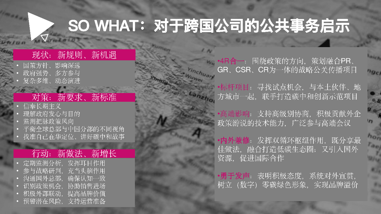 三位演講嘉賓從議題專家、行業實踐者和專業服務者的不同視角出發,深入淺出地勾畫了碳中和的政策圖景與行業趨勢,剖析了外企所面臨的現實挑戰與潛在機會,并就企業如何通過強化政府關系與公共關系借力碳中和給出了獨到的見解。