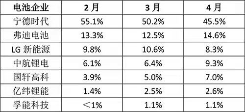 行業(yè)數(shù)據(jù)顯示,剛剛過(guò)去的4月,寧德時(shí)代在中國(guó)市場(chǎng)動(dòng)力電池裝機(jī)量約為3.82GWh,市場(chǎng)占比約為45.5%。這一占比是寧德時(shí)代在中國(guó)市場(chǎng)近年來(lái)的新低。數(shù)據(jù)還顯示,過(guò)去3個(gè)月,寧德時(shí)代在中國(guó)市場(chǎng)的裝機(jī)量占比一直在下滑,2月份為55.1%,3月為50.2%,4月下滑到50%以下。