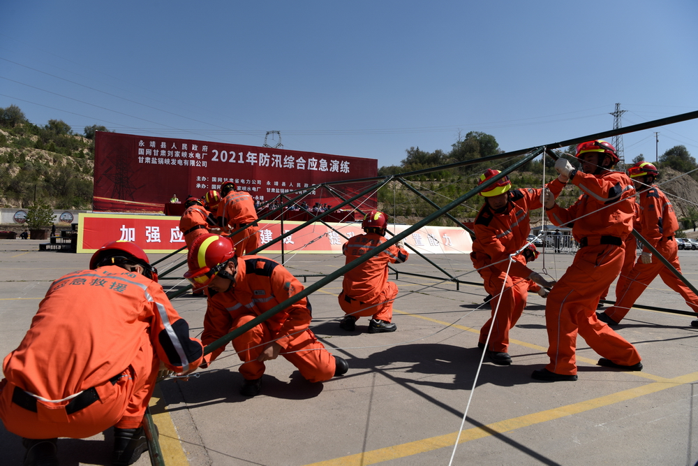 6月4日上午10時,國網甘肅劉家峽水電廠聯合永靖縣人民政府、甘肅鹽鍋峽發電有限公司舉行2021年防汛綜合應急演練。
