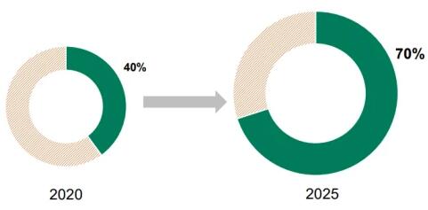 為支持全球能源轉型和可持續發展,勝科致力于將可持續解決方案資產的利潤貢獻從目前的40%到2025年增長為70%。到2025年,可再生能源資產的目標為實現30%的年均復合增長率,綜合性城鎮解決方案資產為10%。