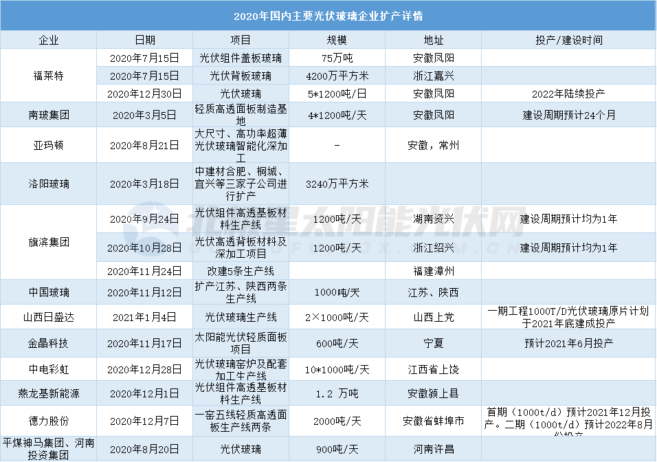 福萊特2020年宣布擴產75萬噸光伏組件蓋板玻璃、年產4200萬平方光伏背板玻璃和5座日熔化量1200噸光伏組件玻璃項目;2021年3月29日再次宣布擴建6座日熔化量1200噸光伏玻璃。