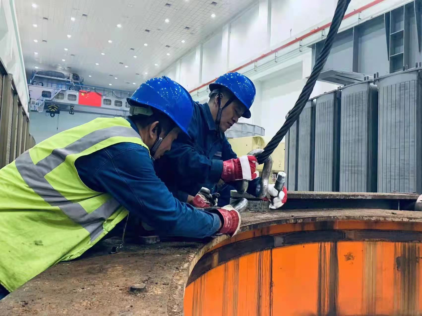 今年10月10日,劉家峽水電廠2號機組整機改造工作正式啟動。馬學明和同事們爭分奪秒完成檢修平臺的搭設后,全身心的投入機組分解起吊任務中。13日上午200噸的上機架順利吊出,14日上午650噸的發電機轉子順利吊出,18日上午114噸的轉輪吊出,至此機組分解工作圓滿完成。轉子起吊是機組分解的“重中之重”,發電機轉子與定子間的間隙只有幾厘米,吊裝時稍有不慎就會撞傷設備、損壞定子線棒絕緣,每次作業不但要協調好工作組成員與橋式起重機司機間的密切配合,還要消滅視覺死角。起吊前,馬學明跑前跑后,檢查橋機并車情況,起重梁的套裝是否安全到位、聯合檢查兩輛橋機行走、起落是否同步,分配工作人員在轉子與定子間插插板,在大件設備起吊前,嚴格做到“三起三落”的試探性起吊……作為總指揮的他,每次都能安全高效地完成轉子吊裝等任務。