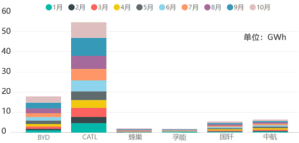 我想從10月和1-10月兩個(gè)圖表來看整體的使用情況,10月份最大的用量還是去了純電動(dòng)乘用車,裝機(jī)量為12.219GWh,占比79.26%。而單臺(tái)車10-30kWh的插電混動(dòng)的用量在10月份也達(dá)到了1.092GWh,充分反映了這個(gè)細(xì)分市場(chǎng)的增速,環(huán)比也保持了16%的增速。