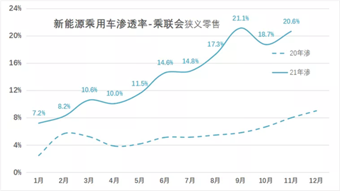 根據乘聯會數據,今年11月,新能源乘用車零售銷量為37.8萬輛,滲透率達到20.6%。1-11月的滲透率為13.9%,較2020年的5.8%提升8.1個百分點。