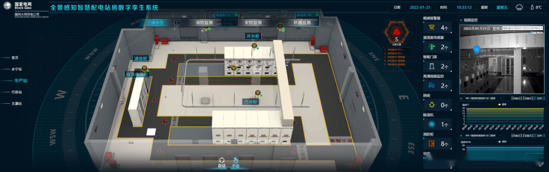 使用數字孿生技術以立體三維方式展示站房的不同區域溫濕度、火災煙霧告警、燈控、視頻和其它預設位信息等,全方位直觀展示站房的運行環境,監測信息一目了然。