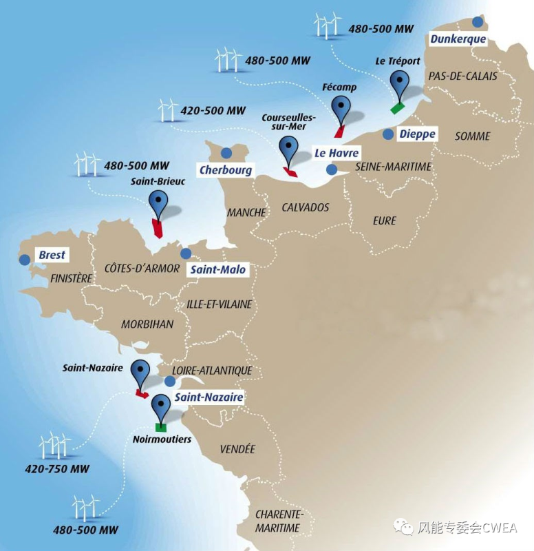 法國海上風電地圖,左下角紅色Saint Nazaire今年將上線