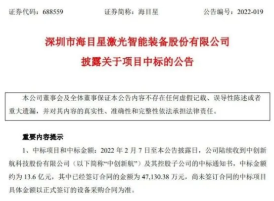 4月24日,海目星發布公告稱,2022年2月7日至本公告披露日,公司陸續收到中創新航及其控股子公司的中標通知書,中標項目為裝配段設備及生產線項目,中標金額約為13.6億元。