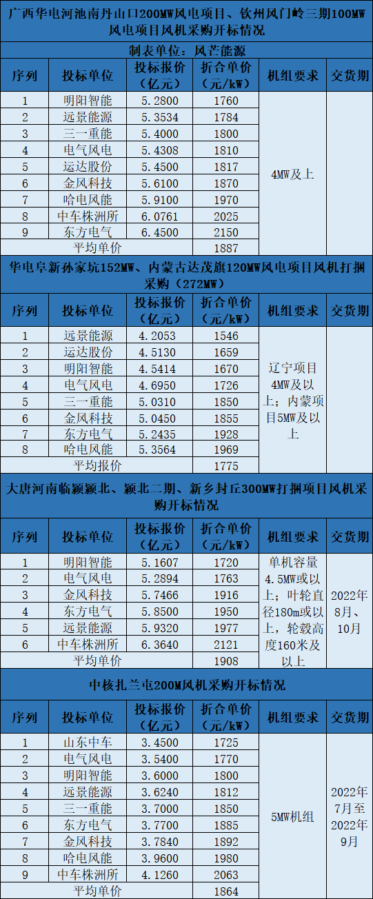 最低1546元/kW!華電、大唐等8個項目共計1.1GW風機采購開標