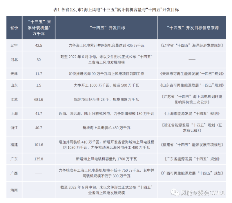 據統計,截至2022年6月中旬,我國共有9個省(區、市)通過文件形式公布或征求過“十四五”海上風電的具體發展規模相關意見。另有1個省份通過非正式下發文件的形式,透露自身的“十四五”海上風電發展規模。為方便讀者參考,本文對各省(區、市)“十四五”海上風電裝機規模的具體目標進行了整理與匯編。