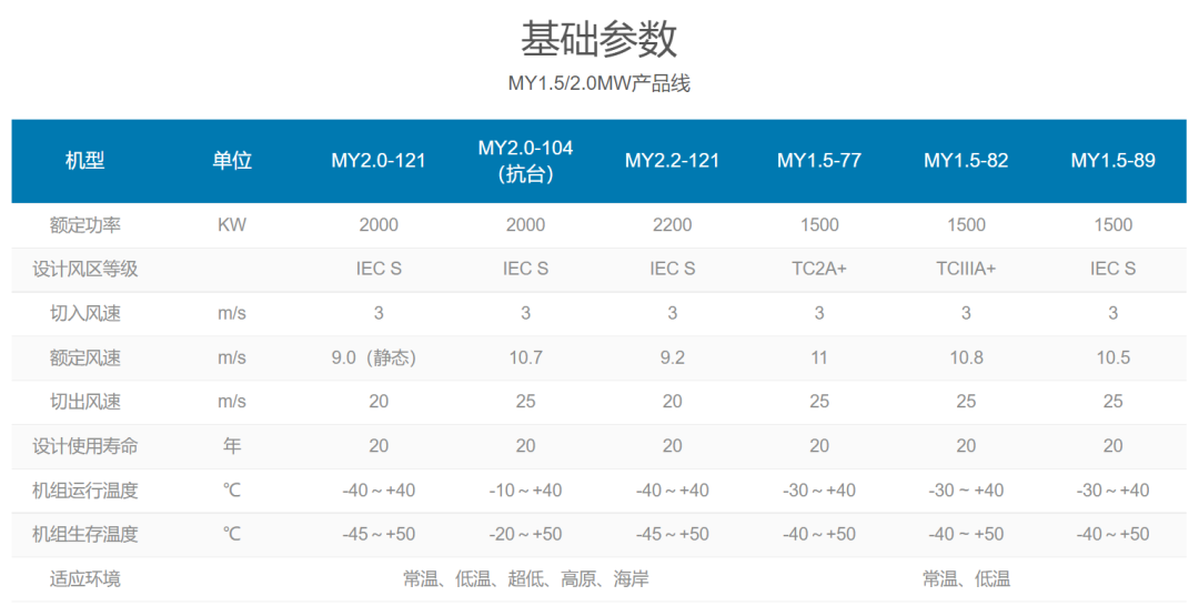 根據其官網公示,MY1.5/2.0MW產品線為雙饋風力發電機組,葉輪直徑包括77-121米。MySE3.0MW-6.0MW均為全球半直驅緊湊型傳動技術路線。