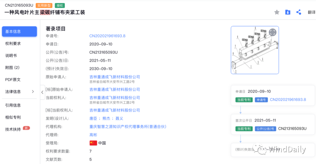 重通成飛2020年也申請了風(fēng)電葉片主梁碳纖維相關(guān)專利。