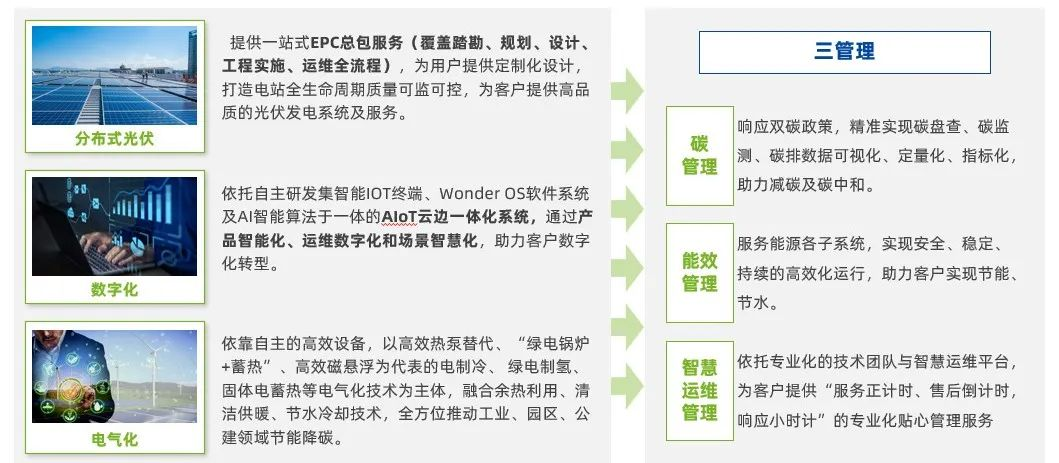 雙良智慧能源于今年正式成立光伏+事業(yè)部,并結(jié)合“供能端零碳技術”和“用能端減碳技術”的技術路線,整合自身傳統(tǒng)業(yè)務優(yōu)勢,提出"一光兩化三管理"的光伏+綜合解決方案,即分布式光伏電站一站式 EPC 總包服務+數(shù)字化+電氣化,并在數(shù)據(jù)終端實現(xiàn)碳管理、能效管理、智慧運維管理,助力客戶降低能源費用、提高能源保障能力、降低碳排放及助力綠色示范創(chuàng)建。