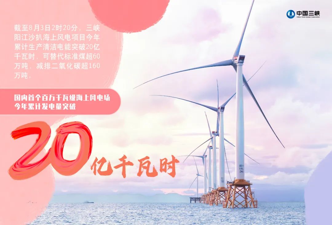 截至8月3日2時20分,國內首個百萬千瓦級海上風電場——三峽陽江沙扒海上風電項目今年累計生產(chǎn)清潔電能突破20億千瓦時,可替代標準煤超60萬噸,減排二氧化碳超160萬噸,為助力實現(xiàn)碳達峰、碳中和目標,促進經(jīng)濟社會發(fā)展全面綠色轉型作出重要貢獻,也為能源保供提供了電力保障。