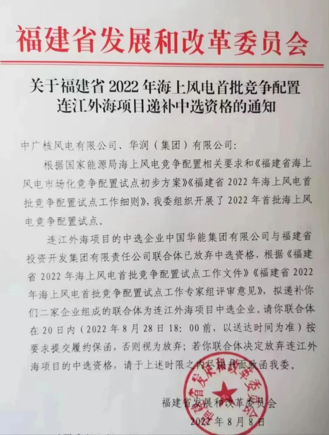 根據《通知》,連江外海(700MW)項目的中選企業中國華能集團有限公司與福建省投資開發集團有限責任公司聯合體已放棄中選資格。
