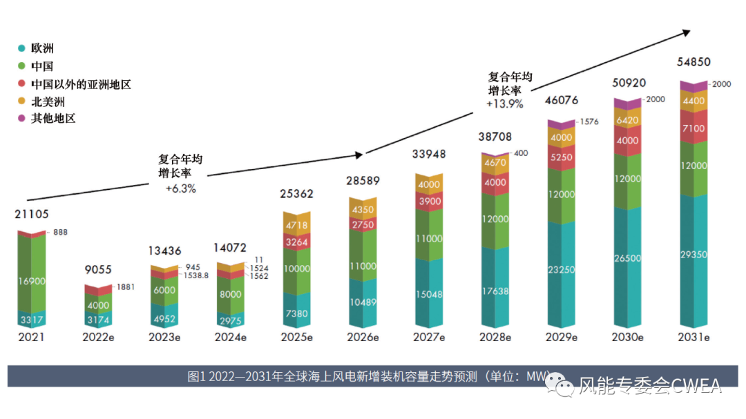 其中的29% 裝機,將在2022-2026年完成,其余的將在2027-2031 年部署;從2021 年到2031 年,全球海上風電年新增裝機容量有望增加一倍以上, 從21.1GW提高到54.9GW。