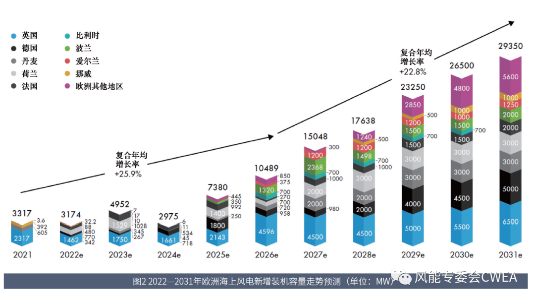 全球風能理事會預測,歐洲將在2022-2031 年保持兩位數的增長,這是由于:固定式海上風電已經成為繼陸上風電和太陽能光伏后,最具競爭力的發電技術;漂浮式海上風電商業化不斷取得進展,將釋放深水海域風能資源開發潛力;歐盟委員會在2020年11 月提出了海上可再生能源戰略,作為歐盟綠色協議的一部分,設定了到2050 年海上風電累計裝機容量達到300GW 的目標,這使海上風電發展成為實現2050 年凈零目標的關鍵;歐洲發展“Power to X”的雄心,為海上風電市場提供了進一步增長的機會。