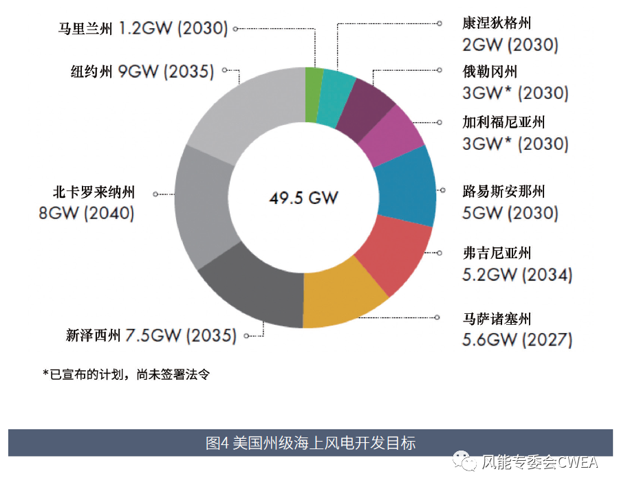 路易斯安那州在2022 年第一季度宣布了5GW 的海上風電發展目標,隨后加利福尼亞州和俄勒岡州各宣布了3GW 的漂浮式海上風電發展計劃,使州一級的海上風電發展總目標達到近50GW。