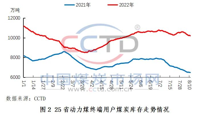 重點關注終端庫存去化情況。當前,終端庫存水平居于相對高位,根據CCTD中國煤炭市場網獨家監測的數據顯示,截至8月11日,沿海8省+內陸17省共25個省份的動力煤終端用戶庫存仍保持在1億噸以上,同比增長接近60%。值得注意的是,今年初伏、中伏期間,超高溫帶動日耗持續攀升,但終端庫存去化并不明顯,那么,隨著“三伏天”接近尾聲,后期終端高庫存將更加難以去化,市場煤價將承壓。