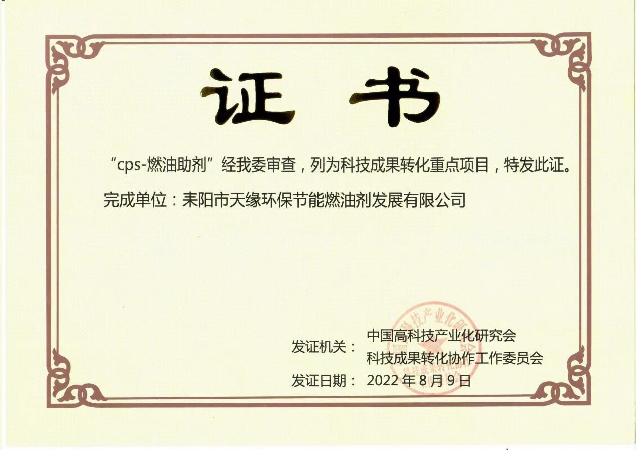 CPS-燃油助劑發明和創造了低碳石油,解決了常規石油尾氣排放問題,開了低碳石油技術的歷史先河,從根本上可以解決因石油尾氣排放因素所造成的空氣污染,是治理霧霾、緩解氣候變化現象的一項最直接、最有效的技術,是發展低碳經濟、實行節能減排國家規劃綱要,是維護中華民族長遠利益的必然要求。技術于2003年9月9日通過省科技成果鑒定,該項技術的成功出現,為我國稠油加工多功能高效助劑領域的空白增添了一筆色彩,該技術在國內燃油助劑研究領域處于領先水。同年12月又通過了省高科技產品(項目)認定,榮獲2003年省新技術新產品創新金獎,2004年衡陽市科技進步一等獎,省科技進步三等獎。CPS-燃油助劑項目更是被授予“省科技成果重點推廣計劃項目”。2011年10月21日該技術再次通過了國家科技成果鑒定。2016年5月15日完成科學技術評價,中高科評字[2016]第003號,2022年8月列入“科技成果轉化重點項目”。該項目技術經過專家多次的評審分析和可行研究,技術成熟,產品市場潛力巨大,經濟社會效益明顯,是一項節能減排的重大科技成果項目。它發明和創造了清潔低碳石油,為人類造福,還人類一個美好的清新自然的生活環境,是實現低碳石油應用最有效的一項科學技術。