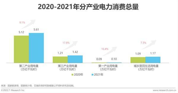 首先,根據(jù)艾瑞咨詢《2022年中國(guó)電力產(chǎn)業(yè)數(shù)字化研究報(bào)告》,2021年,我國(guó)全社會(huì)用電量達(dá)83129億千瓦時(shí),同比增長(zhǎng)10.5%。分產(chǎn)業(yè)看,受數(shù)字經(jīng)濟(jì)發(fā)展影響,以第三產(chǎn)業(yè)為首的新興領(lǐng)域用電需求陡增(如充換電服務(wù)業(yè)),2021年第三產(chǎn)業(yè)用電量同比增長(zhǎng)17.8%。然而電力生產(chǎn)增速放緩,2021年全社會(huì)用電量超出發(fā)電量約0.2萬億千瓦時(shí)。