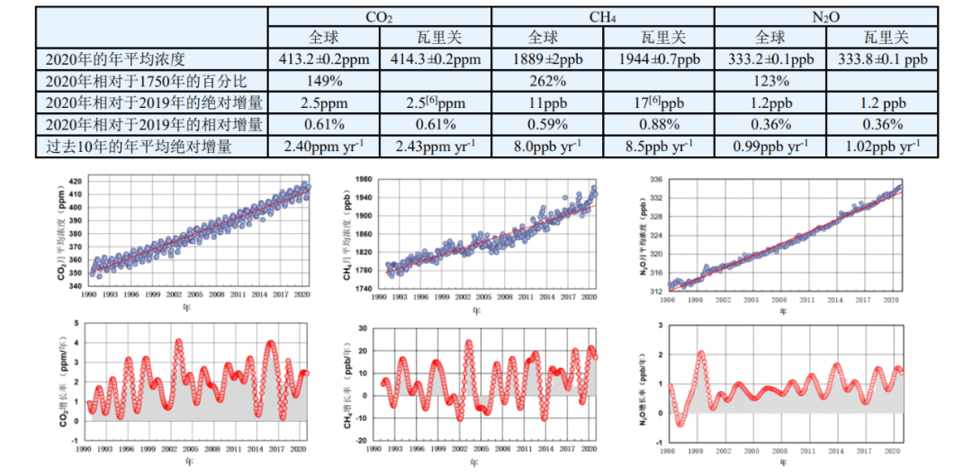 公報介紹,目前中國氣象局有7個國家大氣本底站開展溫室氣體業務觀測,分別為青海瓦里關、北京上甸子、浙江臨安、黑龍江龍鳳山、湖北金沙、云南香格里拉和新疆阿克達拉。瓦里關國家大氣本底站是世界氣象組織全球32個大氣本底站之一。2020年瓦里關國家大氣本底站觀測的二氧化碳、甲烷和氧化亞氮的濃度分別為414.3±0.2 ppm、1944±0.7 ppb、333.8±0.1 ppb,與北半球中緯度地區平均濃度大體相當,二氧化碳濃度較2019年增幅約2.5ppm,與全球增幅持平。2020年我國6個區域本底站的CO2和CH4濃度與2019年相比總體呈現增加趨勢。